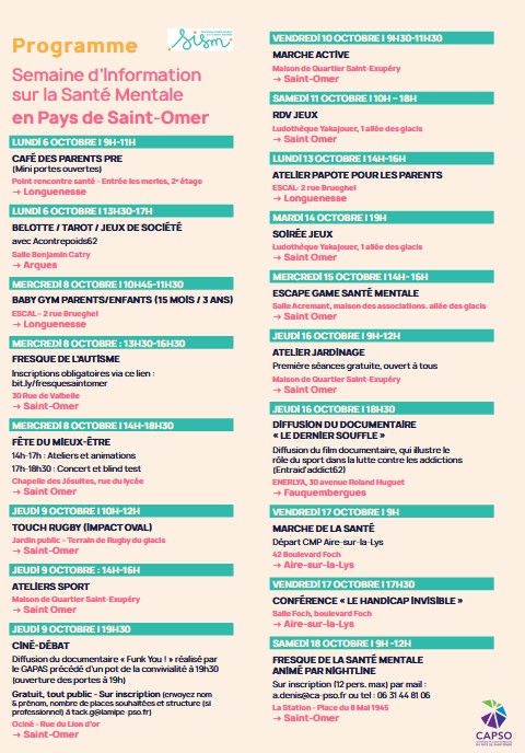 Différents évènements ont lieu sur le territoire de la CAPSO du 06 au 18 octobre 2025, autour de la thématique suivante : « Pour notre santé mentale, réparons le lien social «